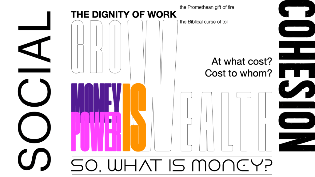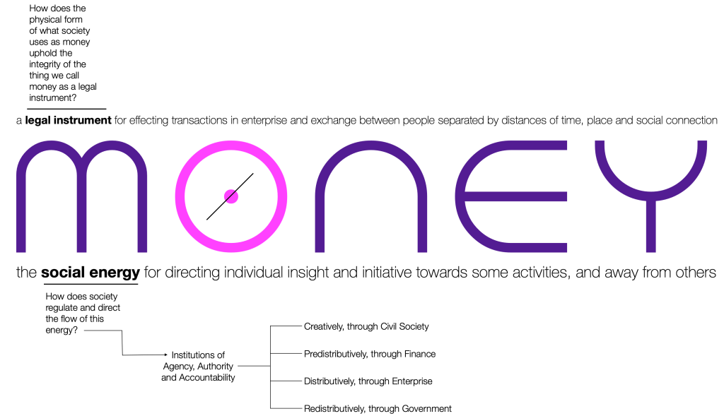 using money, as a call upon the time, effort and expertise of others through legal instruments for effecting transactions between people separated by distances of time, of place and of social connection (“you don’t have to trust the other person, if you can trust their money”) as “a technology communities use to trade debts” (Michael Mainelli) through which society directs our individual time, effort and expertise into some activities (“you can make good money doing that”) and away from others (“there’s no money in that”)