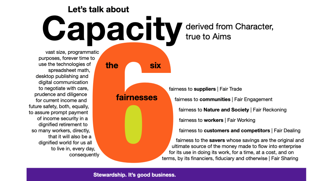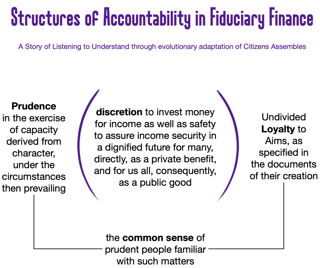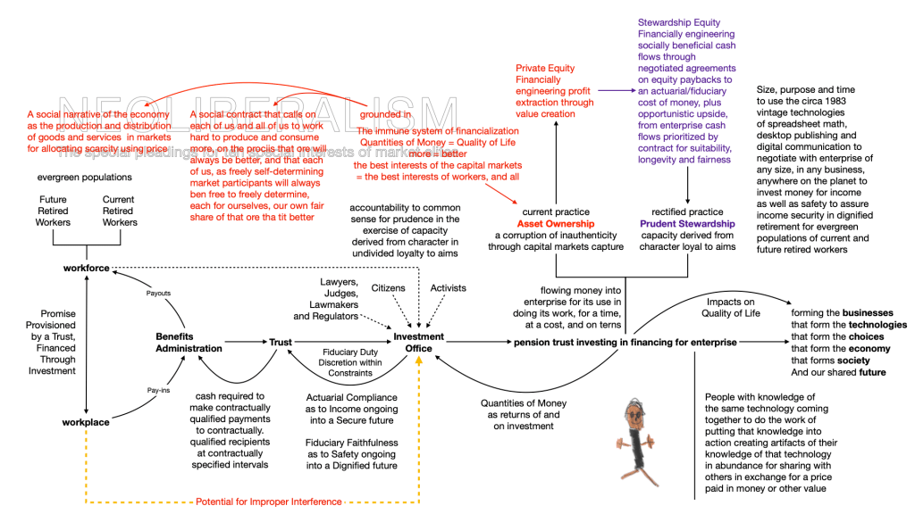 Popular participation in holding Pensions & Endowments accountable for authenticity and integrity in their exercise of the capacity they derive from their character as large, purposeful and self-perpetuating social trusts, to use the personal computing technologies of spreadsheet math, desktop publishing and digital communication to allocate the values-infused money they control to values-aligned enterprise through equity paybacks from prioritized cash flows in undivided loyalty to their aims, to invest the money society entrusts to their discretion for income as well as safety to assure income security in a dignified future to so many, directly, as a private benefit, that it is also, of necessity, for us all, as a public good