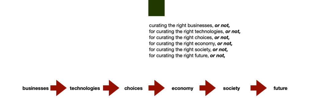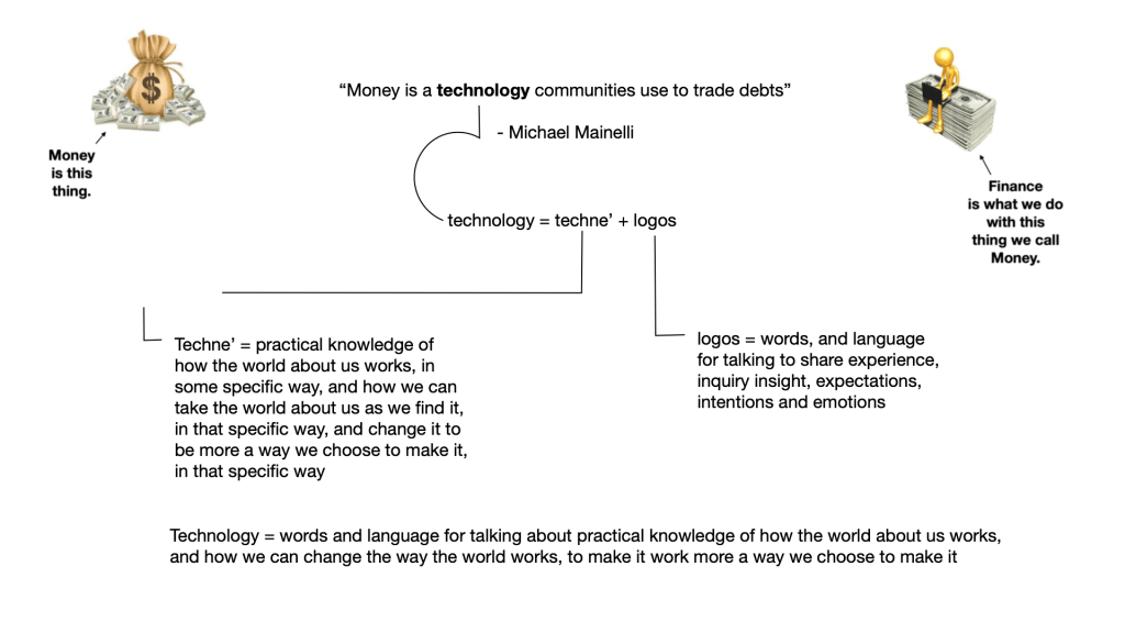 We also participate as savers who set money aside as savings for investment in financing for enterprise. Financiers aggregate our savings, and allocate those aggregations as money made to flow into enterprises, for their use in doing their work, for a time, at a cost and on terms that curate the businesses that curate the technologies that curate the choices that curate the economy that curate society that curates our future.