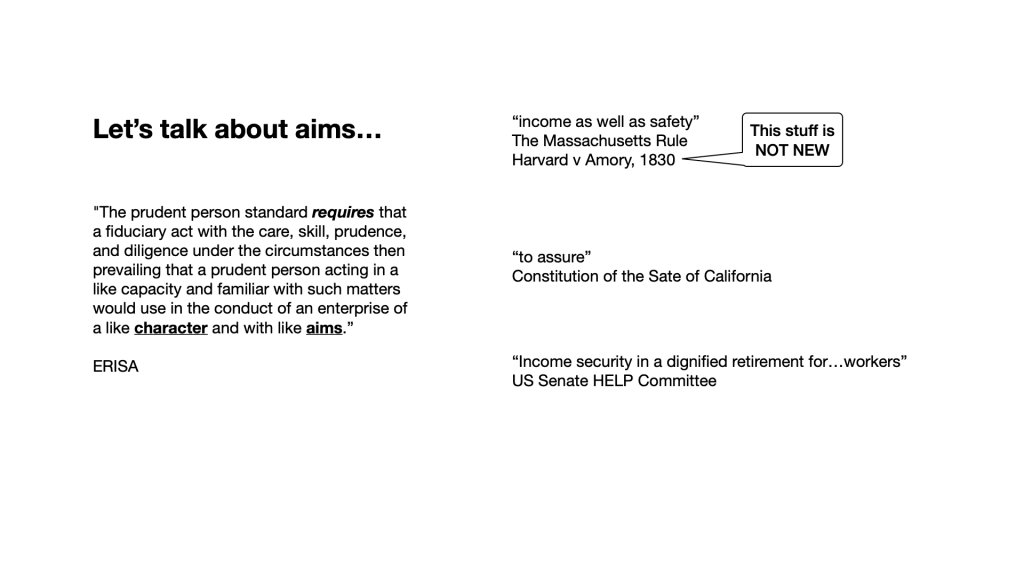This should have shifted the focus of fiduciary practice in the context of a pension trust (and also endowment trusts) back to the question of the capacity that such a trust derives from its character as large, purposeful and self-perpetuating forever machine and its aims, to invest money for income as well as safety to assure income security in a dignified future for so many, directly, as a private benefit, that it is also, of necessity, for us all, consequently, as a public good.
