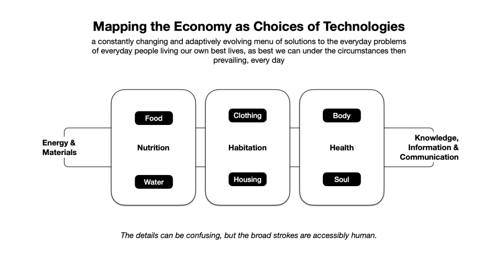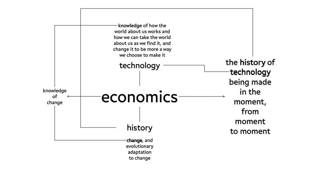 I think about Economics as the study of the once and future history of enterprise for sharing, in exchange for a price paid in money or money equivalents, an abundance of uniquely-fit-to-the-circumstances-then-prevailing technology solutions to the everyday problems of everyday people living our own best lives as best we can, under the circumstances then prevailing, every day, through