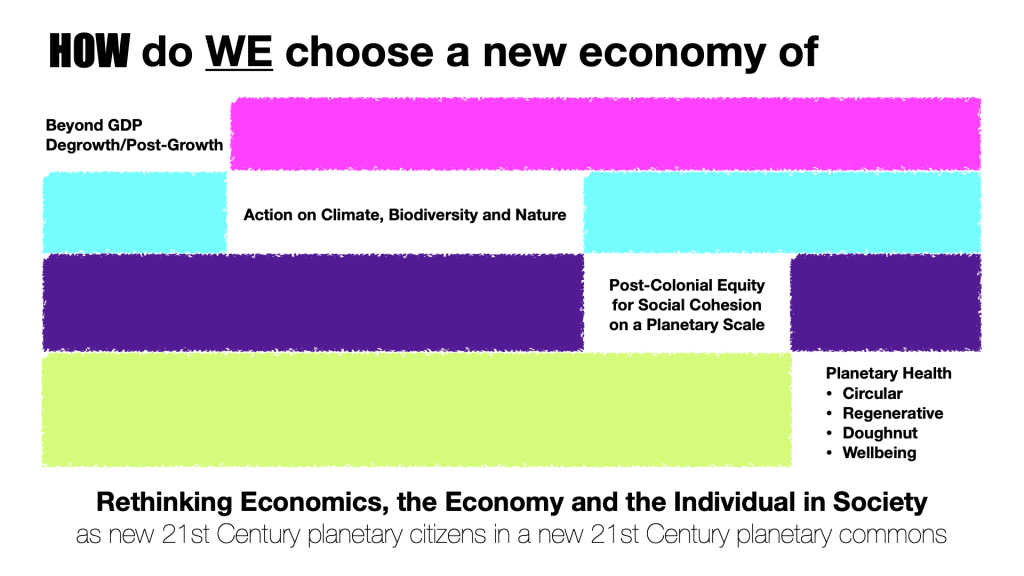 A New Story of a Human-Centered, Money-Powered, Socially-Curated, Adaptively Evolving Economy of Caring for the Consequences, Accountable for Individual and Shared Human Being and Wellbeing on a Planetary Scale, within Planetary Limits, to the Common Sense of What Makes Sense to a New 21st Century Planetary Citizenry in a New 21st Century Planetary Commons,.