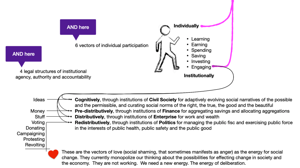 I see a need for a Human-centered, Money-powered economy that is curated socially, through institutions of Civil Society, Finance, Enterprise and Politics.