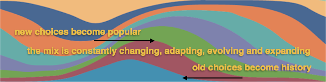 that informs innovative new technologies that inspire innovative new enterprises for making new choices more popular to popular choice, as better fit to the circumstances then prevailing, causing previously popular choices to fade into history as a good fit to the circumstances that prevailed at an earlier time