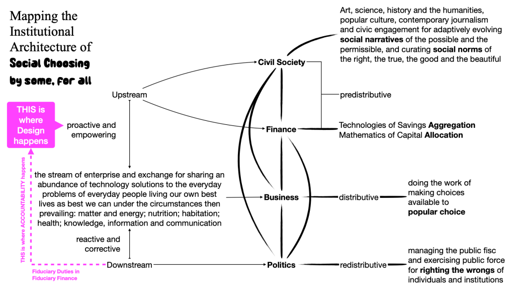 Institutions of Finance are constituted by society with authority to determine, predistributively, upstream from the stream of commerce, which choices will be made available. to popular choice, and who within the population will have the ability to pay the price to make those choices.