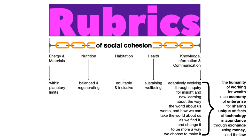 We need Rubrics, more than Metrics: rules for connecting what businesses do business, and how those businesses do business, with the security and dignity of technology suitability, habitat longevity and social equity sufficient to sustain social cohesion on a planetary scale and within planetary limits.