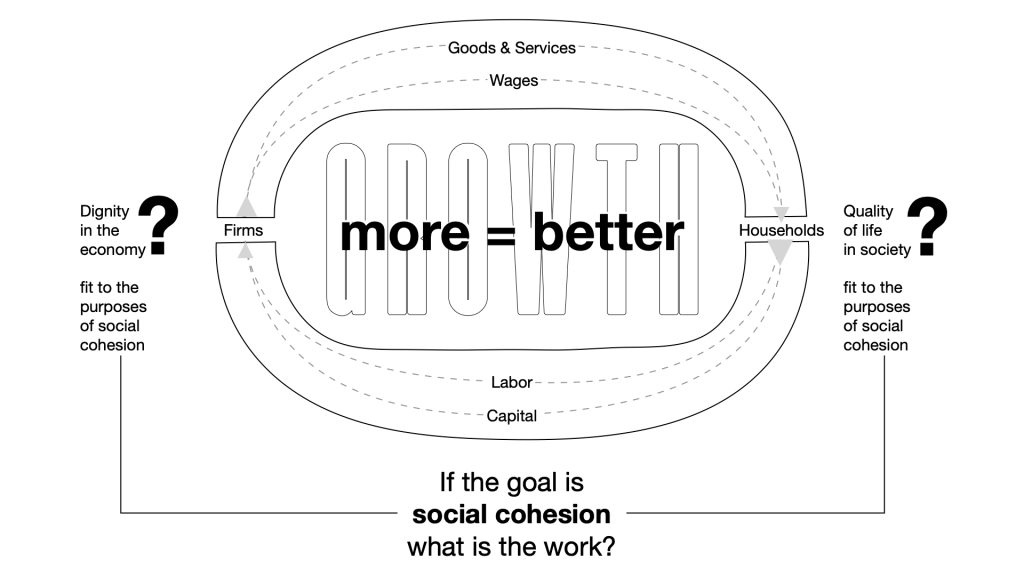 Human enterprise and exchange is filled with tensions, small and large: the drama of “interesting or intense conflicts of forces” (Merriam-Webster dictionary definition of the word, drama). But the currently customary framing of “production and consumption between firms and households” is silent about those tensions. It tells us nothing about structural inequities, or institutional accountability, leaving us to believe, instead, that there are no inequities, and no need for accountability.