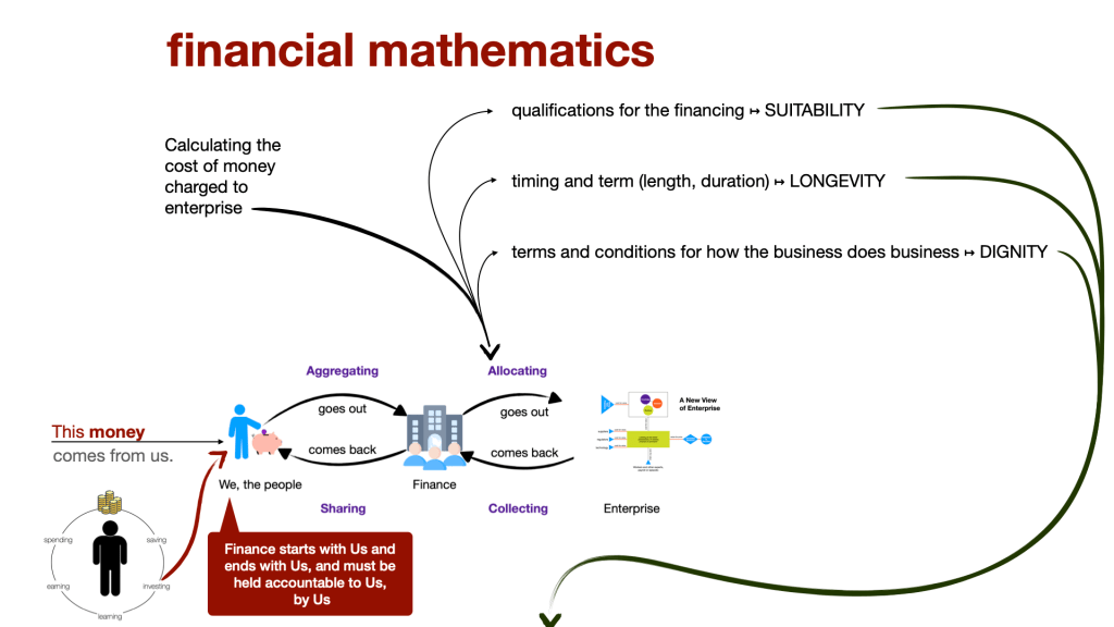In the specify case of financing for enterprise, this configuration of qualifications, duration and conditions empowers and constrains how that business will do its business of applying technology to make choices available in the economy, for social cohesion, through suitability, duration and dignity ongoing into a secure future, or social discord through corruption of the code of accountability, of institutions, to their purpose.