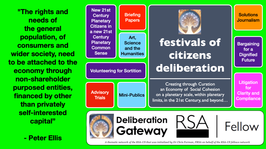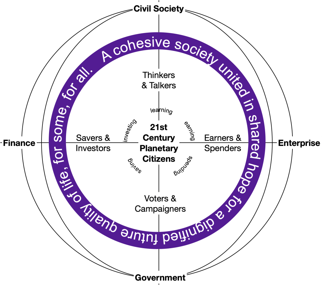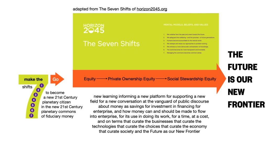 Social Stewardship Equity celebrates society’s shared savings aggregated into social trusts for the social purpose of socially provisioning the social safety nets of Workplace Pensions and Civil Society Endowments as forever promises of a dignified future for some, directly, and for us all, consequently, as a new 21st Century global commons that is accountable to the shared common sense of a new 21st Century planetary citizenship.