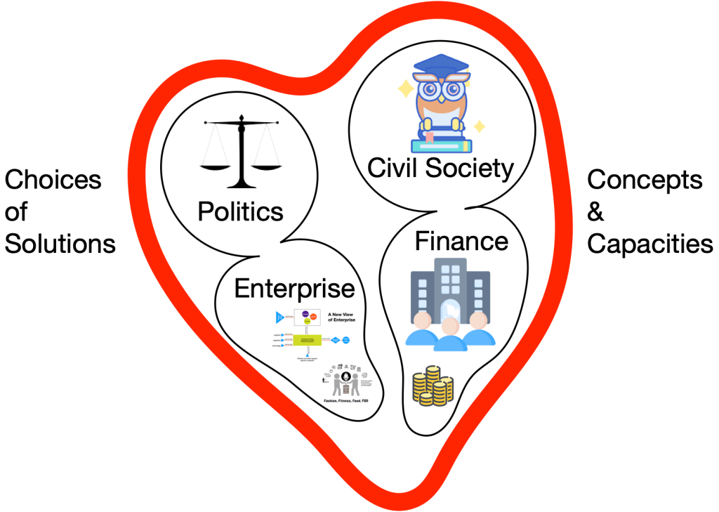 Through institutions of Politics (and Policy) – governmental agencies and authorities from the general to the specialized, at local, regional, national, international, multi-national and global levels – populations manage the public fisc (Taxing and Spending) and exercise public force (law and regulation) to “right the wrongs” when individual and institutional actions stray too far away from social norms and lawful purpose.