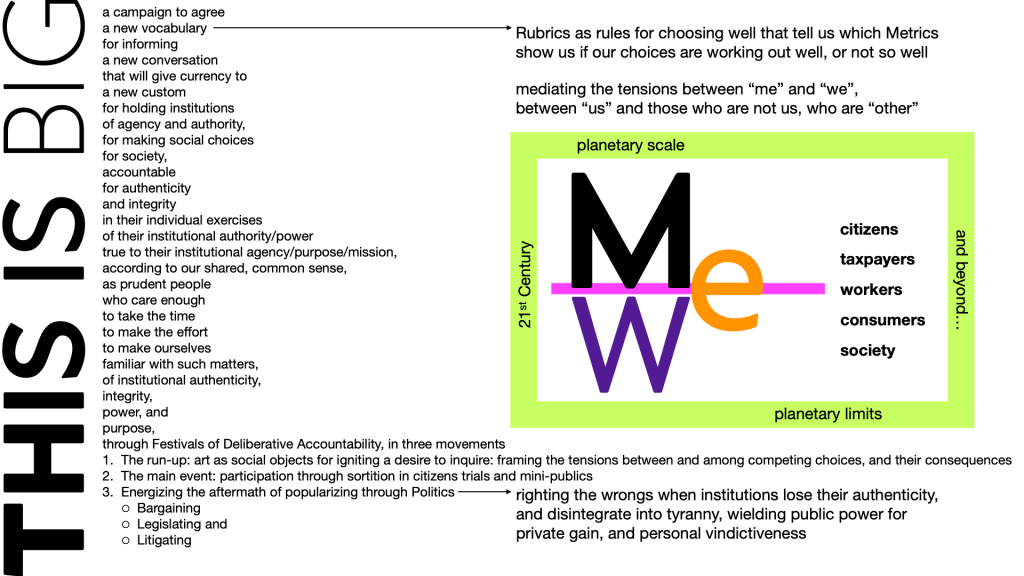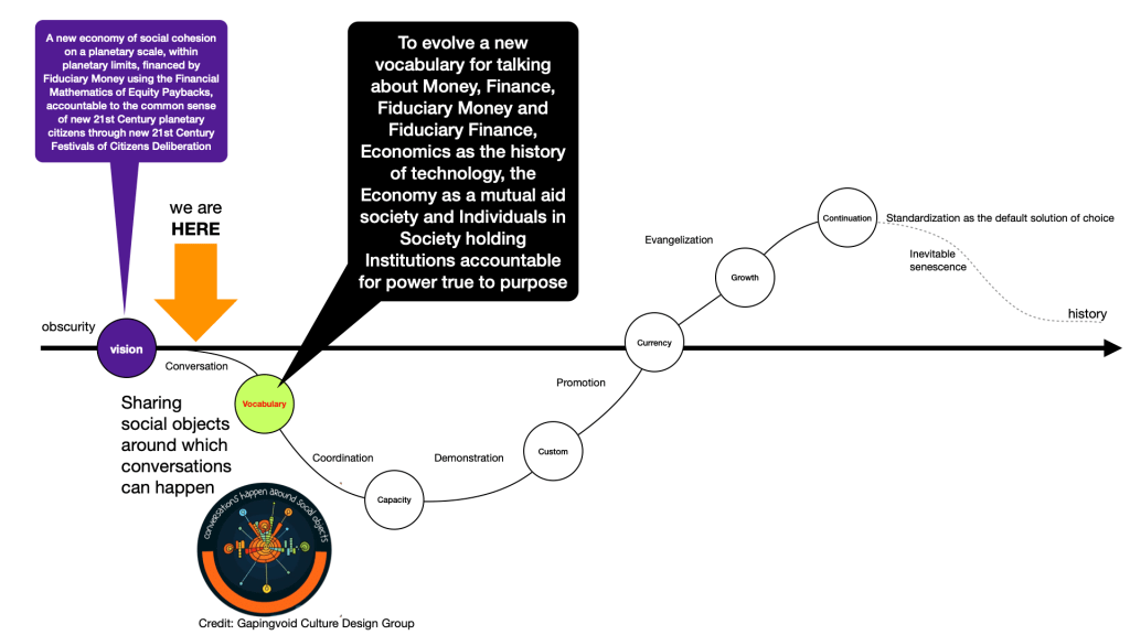Through institutions of Civil Society – schools and universities, libraries and museums, cultural centers, cultural centers, publishing, broadcasting and now social media, journalism and the arts for creating “social objects around which conversations can happen” (Gaping Void Cultural Design Group) – a population adaptively its social narratives of the possible and the permissible, and curate social norms of the right, the true, the good and the beautiful.