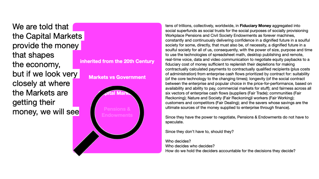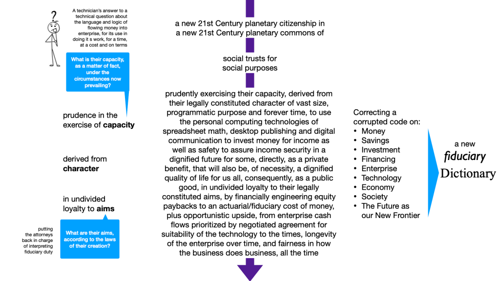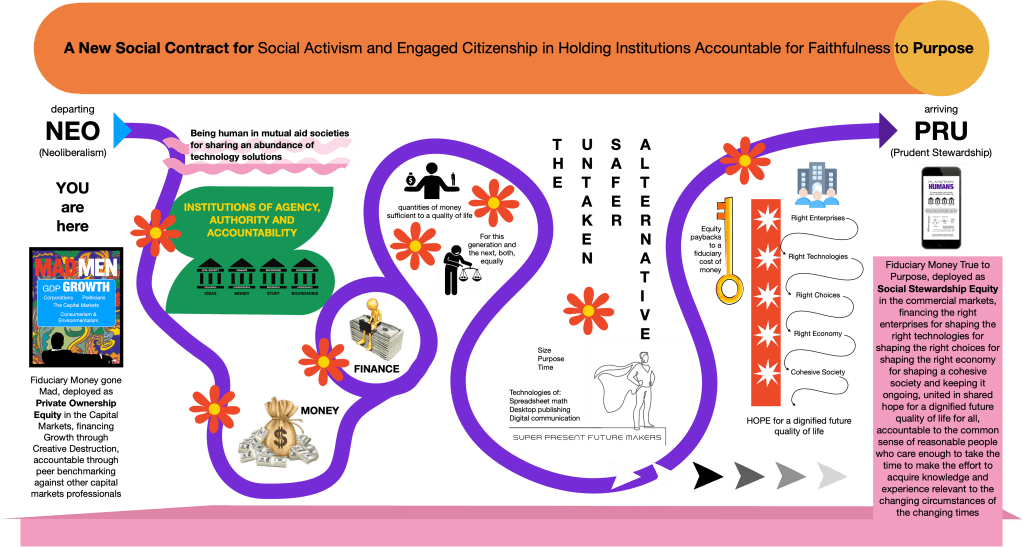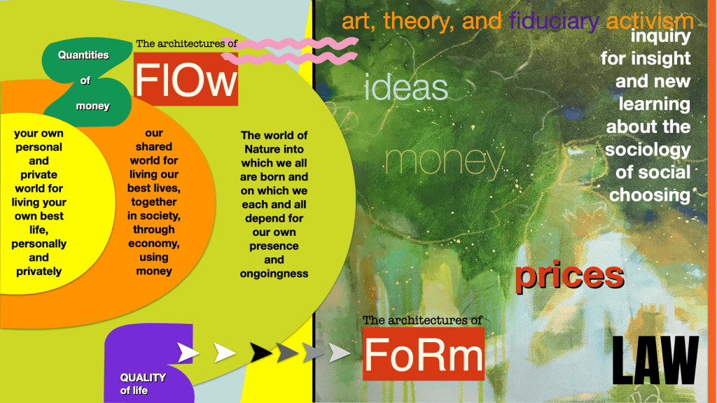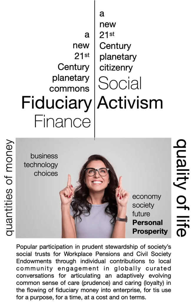 Ambition: to hold those who control fiduciary finance accountable for authenticity and integrity in their notions of value, world-views, financial mathematics and responsibility over social outcomes as stewards of the connections between quantities of money and quality of life, for so many, directly, as a private benefit, that it is also for us all, consequently, as a new 21st Century planetary commons