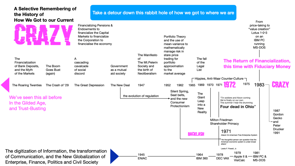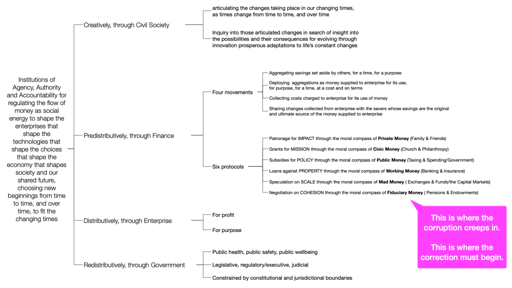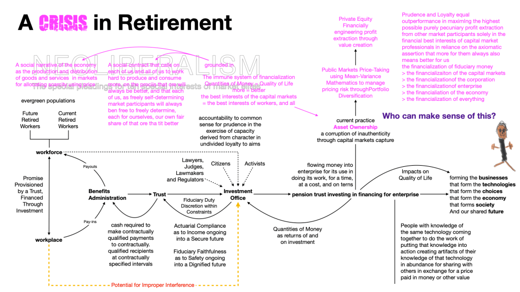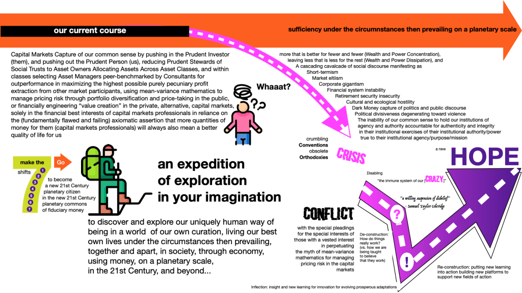 and within classes selecting Asset Managers peer-benchmarked for outperformance in maximizing the highest possible purely pecuniary profit extraction from other market participants, using mean-variance mathematics for portfolio diversification to manage the risk of price-taking in the public, or financially engineering “value creation” in the private, alternative, capital markets, solely in the financial best interest of capital markets professionals, in reliance on the axiomatic assertion that more quantities of money for them will always also deliver a better quality of life to us, shutting down any consideration of the capacity of social trusts and cutting off all consideration of the future consequences of present choices