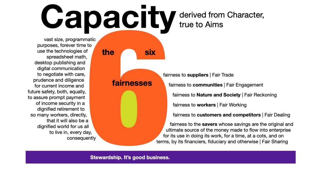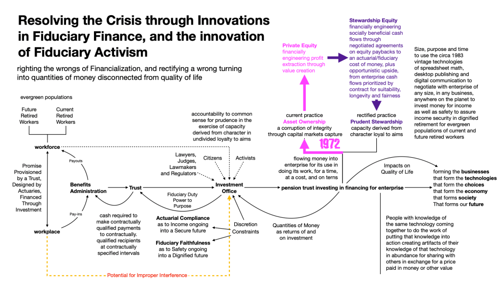through financially engineering equity paybacks to an actuarial/fiduciary cost of money, plus opportunistic upside (for Actuarial Compliance as to income ongoing into a secure future), from enterprise cash flows prioritized by contract for suitability, longevity and fairness across all six vectors of fairness in how business does business (for Fiduciary Faithfulness as to safety ongoing into a dignified future)