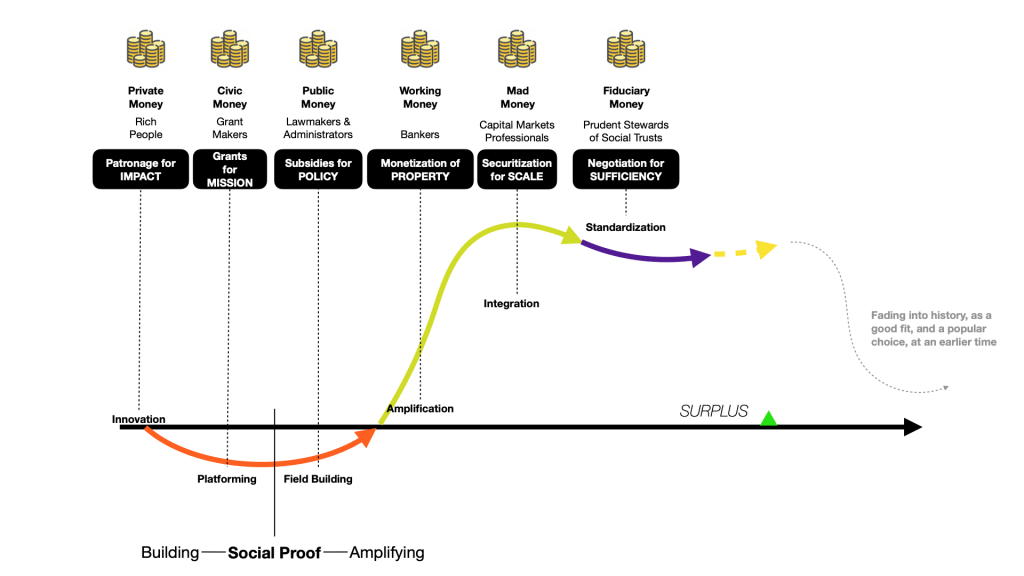 and the mid-century modern social innovation of the social trust for socially provisioning the social safety net of Workforce Pensions, as an evolutionary adaptation of the late 19th Century social innovation of the social trust for socially provisioning the social safety nets of Civil Society Endowments, as an evolutionary adaptation of the early 19th Century social innovation of the private trusts for private purposes of intergenerational wealth transfer